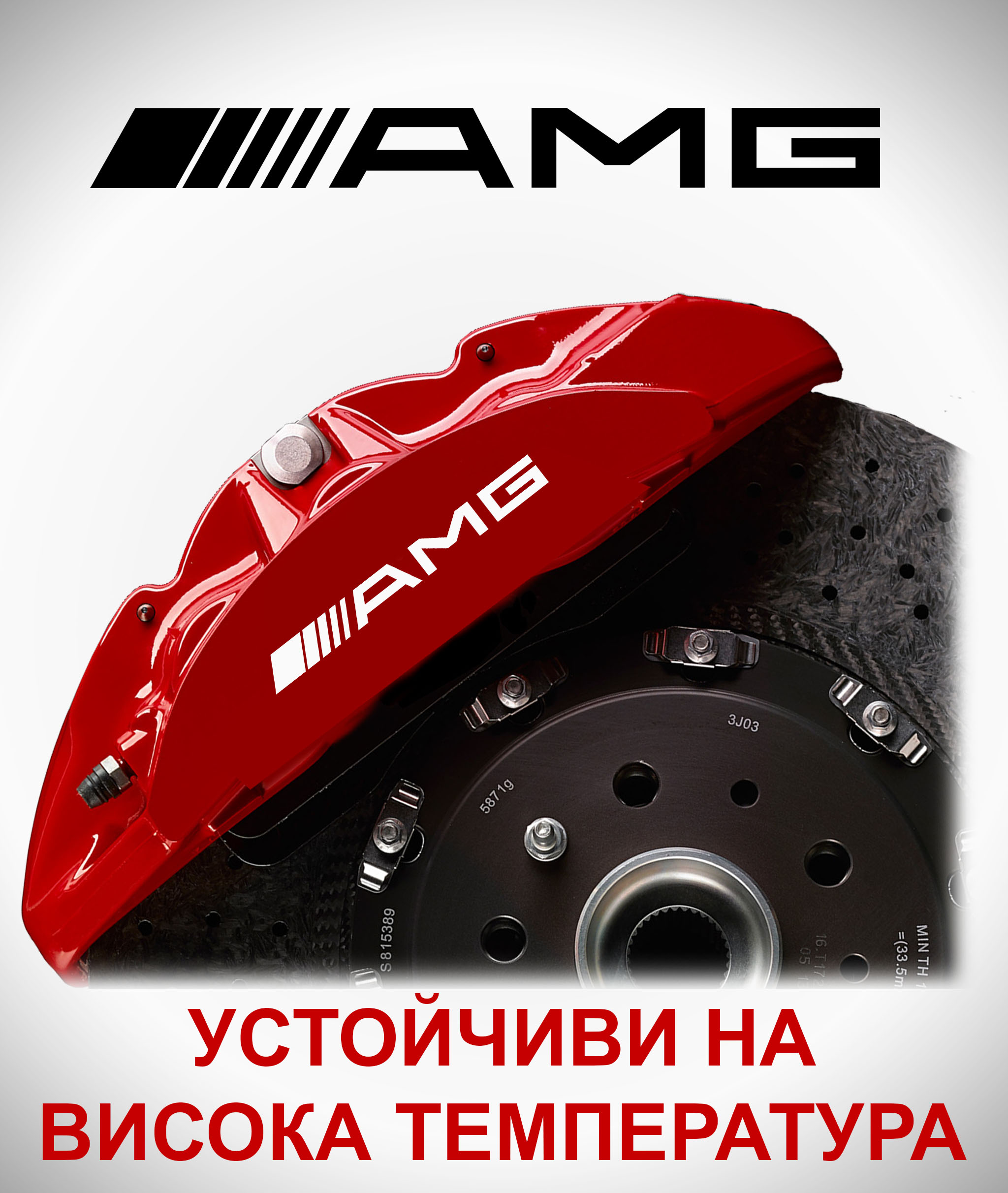AMG стикери за спирачни апарати Комплектът влючва 6 броя стикери в следните размери: 2 x (100x10mm) 2 x (80x8mm) 2 x (75x8mm)